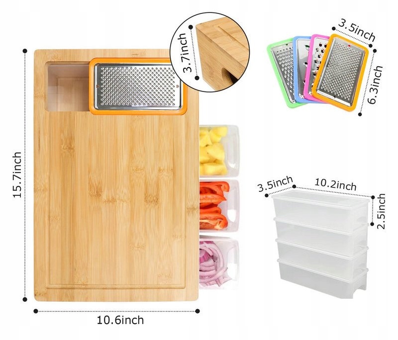 - Łatwa w przechowywaniu: Kompaktowy design sprawia, że deska nie zajmuje dużo miejsca, a wbudowane pojemniki można łatwo przechowywać w lodówce.