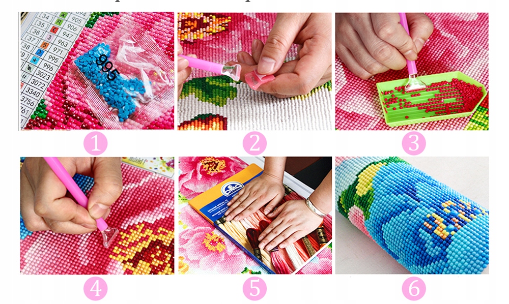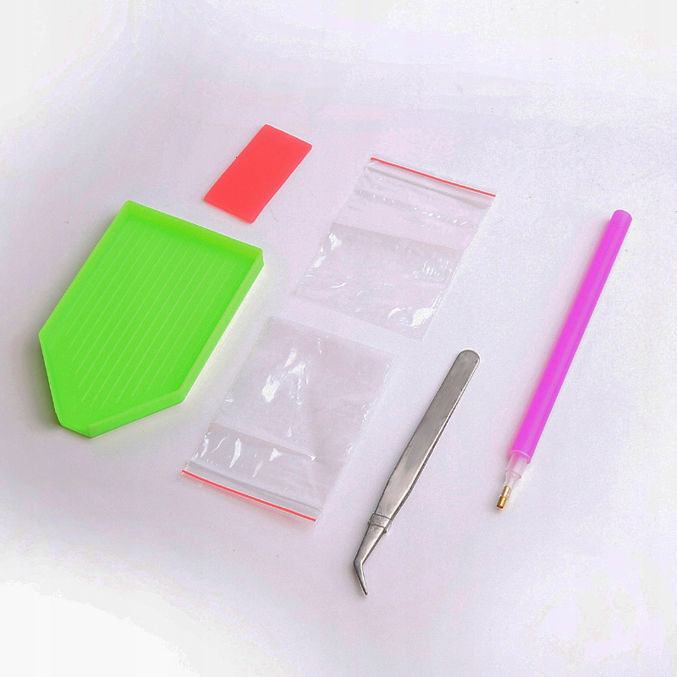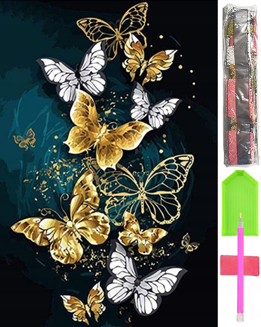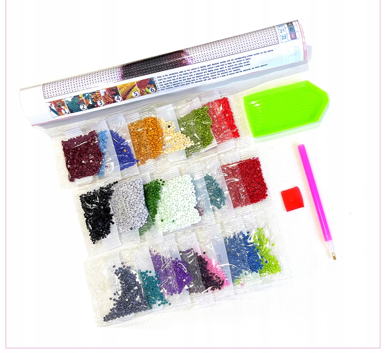 - Zestaw kilkudziesięciu tysięcy kolorowych diamencików do ułożenia obrazu (wraz ze sporym zapasem)