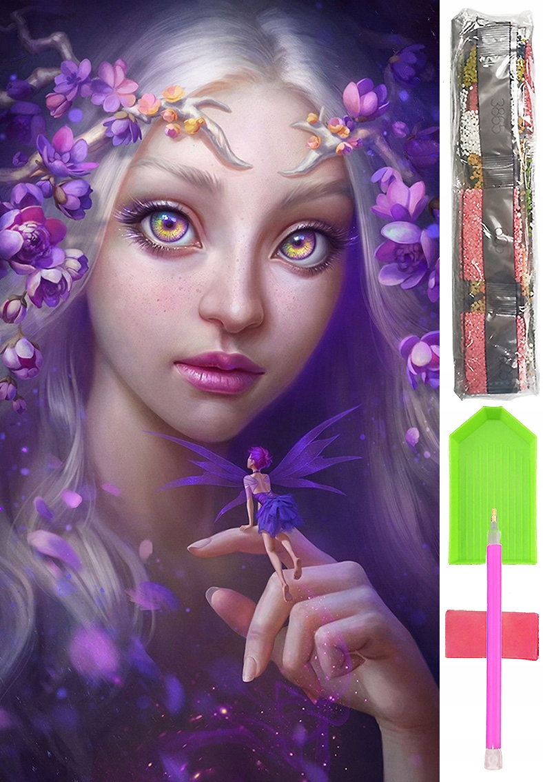 - Zestaw kilkudziesięciu tysięcy kolorowych diamencików do ułożenia obrazu (wraz ze sporym zapasem)