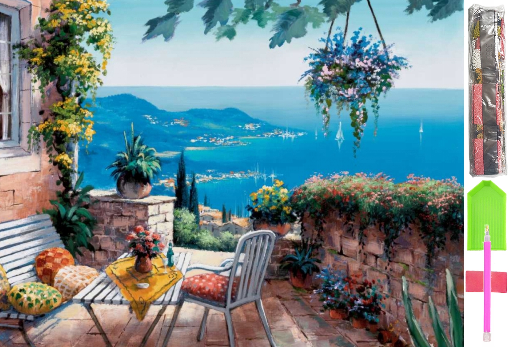 - Zestaw kilkudziesięciu tysięcy kolorowych diamencików do ułożenia obrazu (wraz ze sporym zapasem)