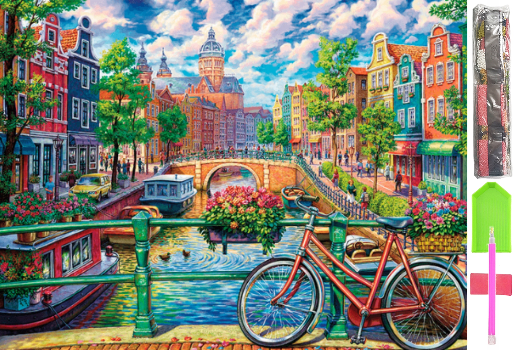 - Zestaw kilkudziesięciu tysięcy kolorowych diamencików do ułożenia obrazu (wraz ze sporym zapasem)