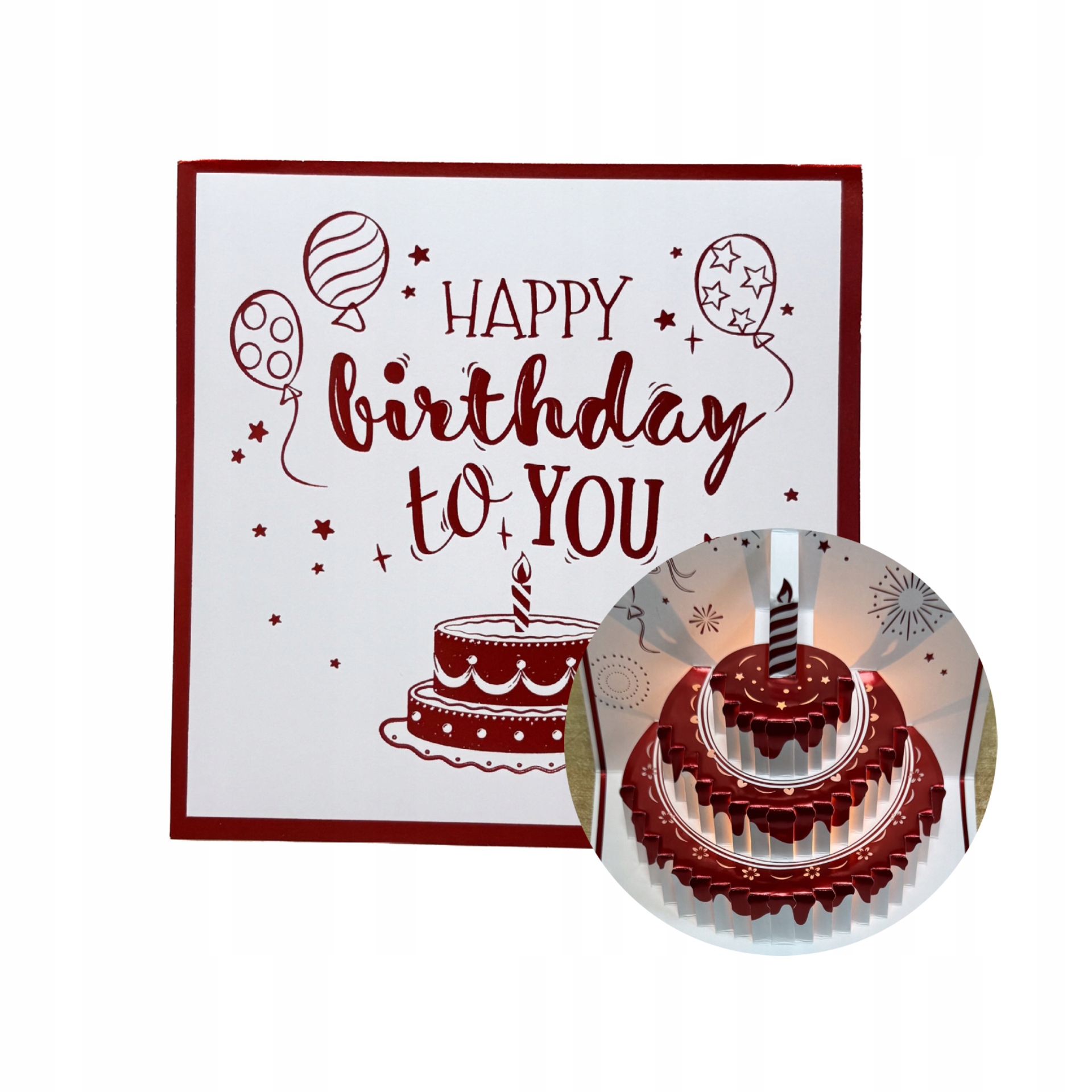 Kartka URODZINOWA GRAJĄCA Melodyjka ŚWIATŁO TORT LED ŚWIECZKA CZERWONA