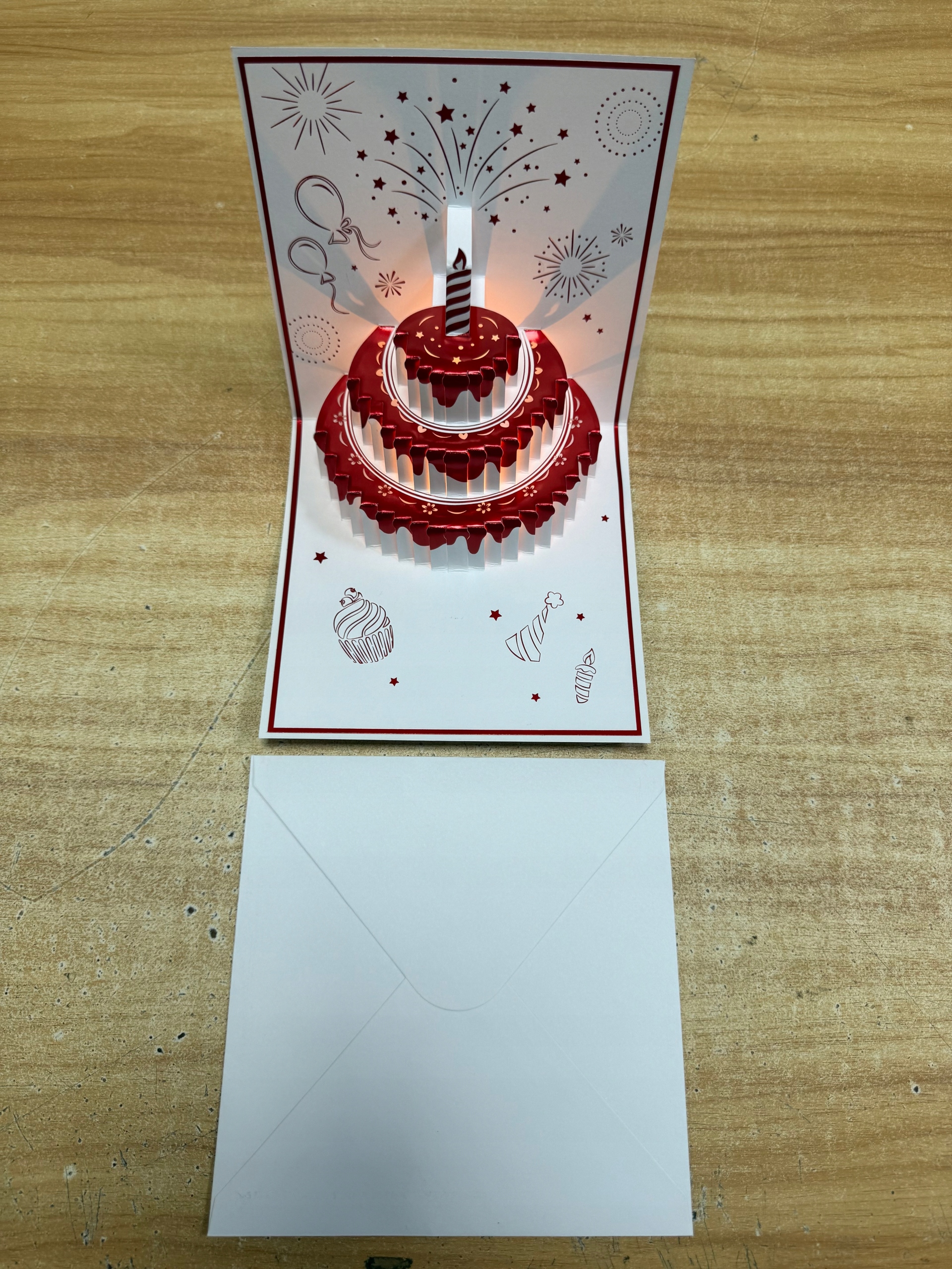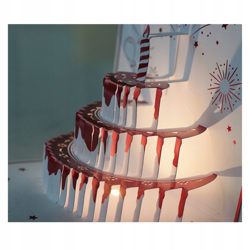 Zaskocz bliską osobę wyjątkową kartką urodzinową 3D! Po otwarciu kartki wyłania się przestrzenny tort z realistycznym efektem światła i subtelnej iluminacji – wygląda jak prawdziwa świeczka! Idealna niespodzianka zarówno dla dzieci, jak i dorosłych.