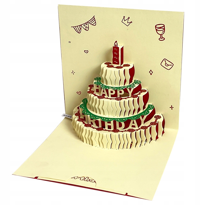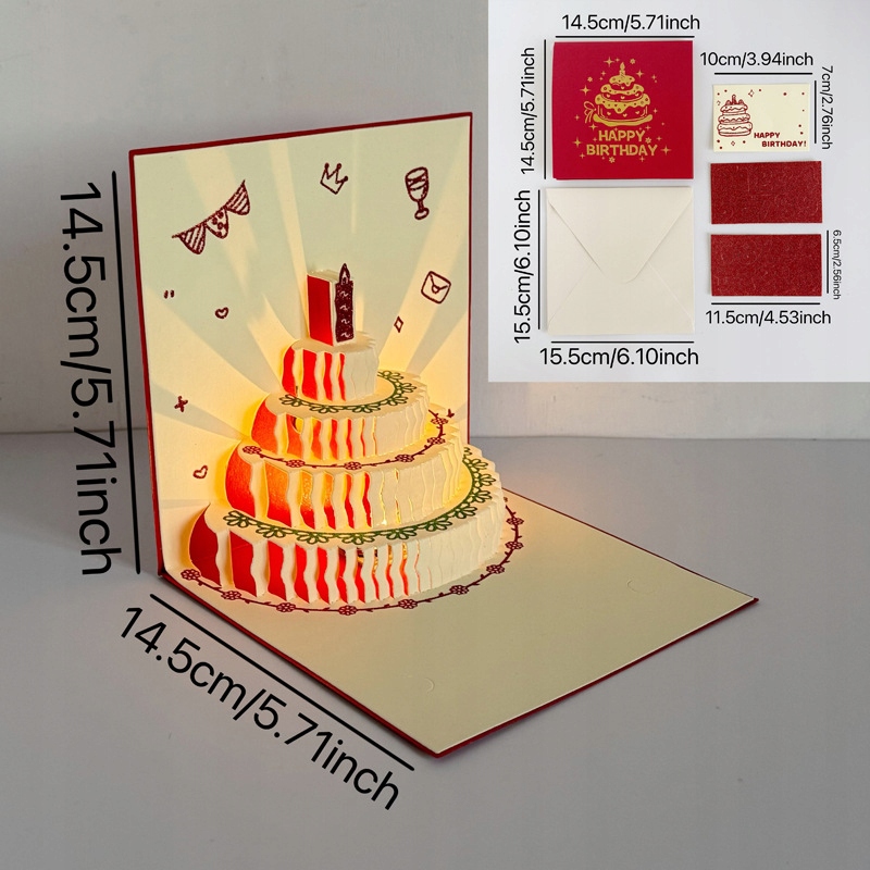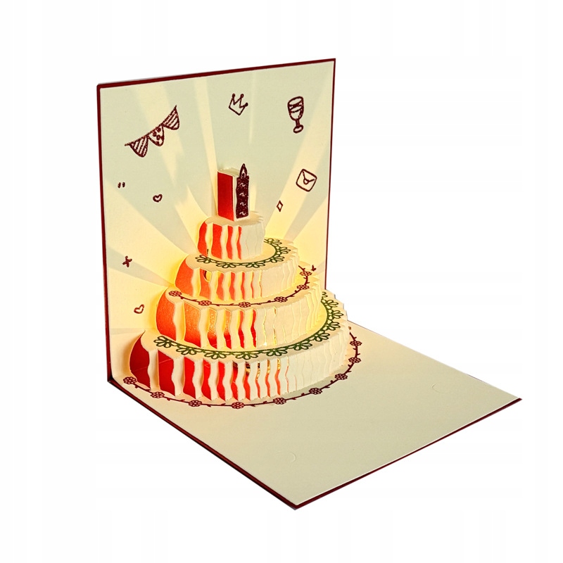 Unikalna kartka urodzinowa, która robi wrażenie! Po otwarciu rozkłada się piękny, trójwymiarowy tort urodzinowy, a w tle rozbrzmiewa melodia „Happy Birthday”. Wbudowane światło rozświetla tort, tworząc niesamowity efekt świetlny, który zachwyci każdego jubilata.
