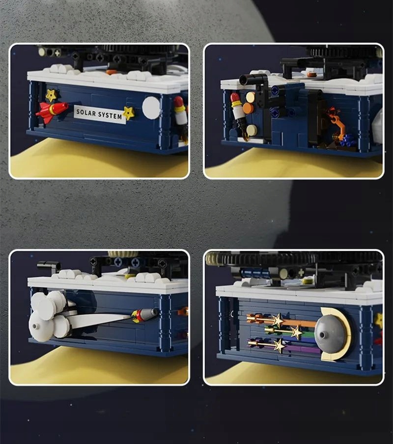 - Solidna podstawa z dekoracjami: Podstawa modelu przedstawia sceny kosmiczne, w tym rakiety, meteory i planety, nadając całości unikalnego charakteru.