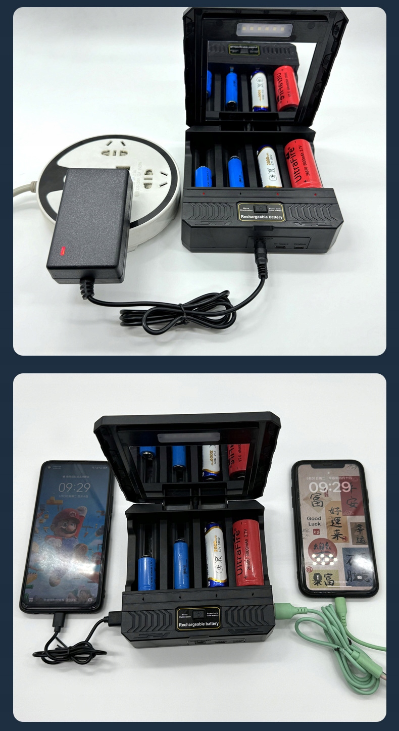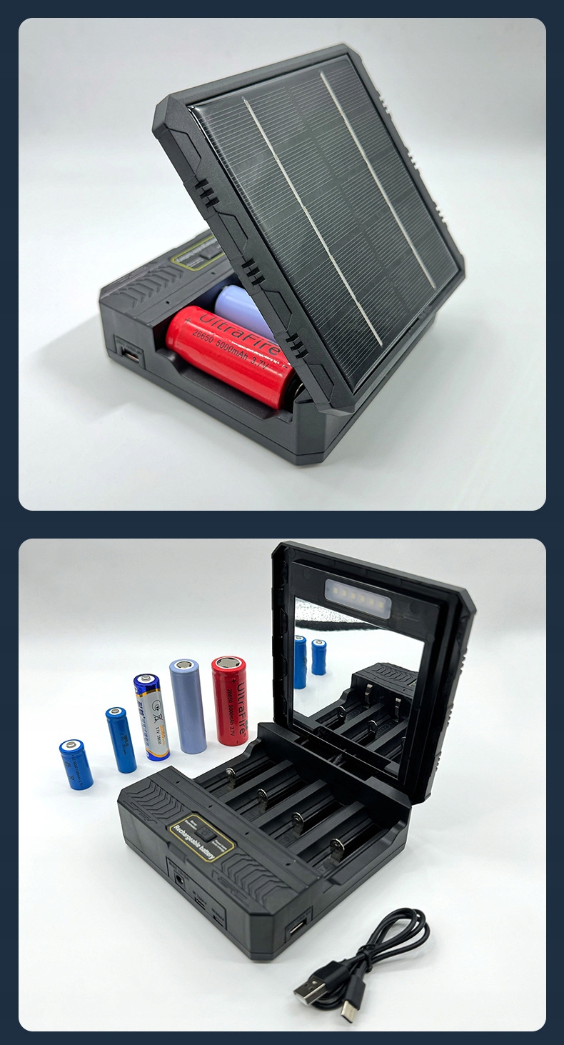 Ładowarka solarna na 4 akumulatory Li-Ion z lusterkiem i powerbankiem