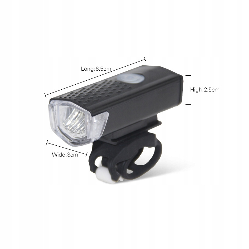 - PRZÓD: Mocna dioda led białe światło (5000K), 3 tryby 100% jasności (2h), 50% jasności (6h), pulsujące (10h)