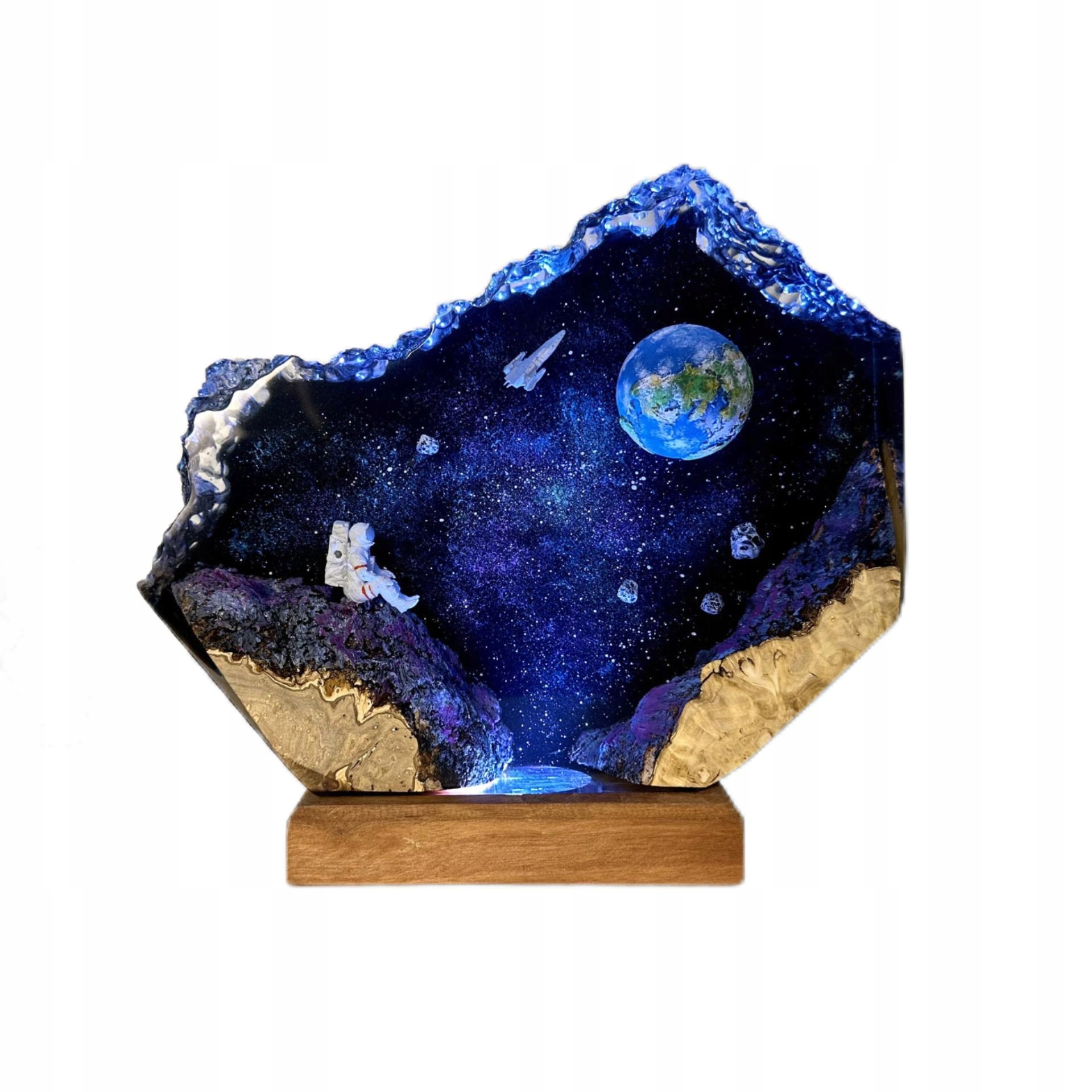 Ta ręcznie wykonana lampka nocna to wyjątkowe połączenie rzemiosła i nowoczesnej estetyki, która przenosi nas w przestrzeń kosmiczną. Stworzona z naturalnego drewna i żywicy epoksydowej, lampka odzwierciedla fascynującą scenę gwiezdnej podróży – widok astronauty w przestrzeni kosmicznej, Ziemi i dryfujących statków kosmicznych. Kolory galaktyki, połączone z delikatnym światłem LED, tworzą magiczną atmosferę, która ożywia każdą przestrzeń.