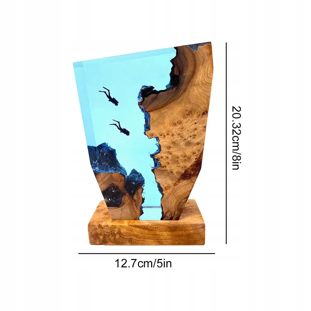 Lampka osadzona jest na eleganckim, oddzielnym stojaku z wbudowanym oświetleniem LED. Stojak równomiernie podświetla żywicę, wzmacniając efekt świetlny i sprawiając, że elementy drewna oraz sylwetki nurków są wyraźnie widoczne, tworząc relaksującą, nastrojową aurę.