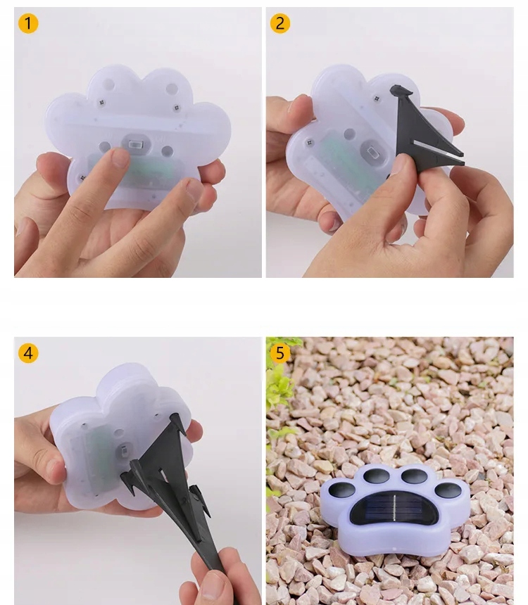 Każdy zestaw zawiera kilka lamp, które można rozmieścić według własnych upodobań, tworząc unikalną ścieżkę światła w kształcie śladów łap. To doskonały pomysł na prezent dla miłośników zwierząt i oryginalną dekorację ogrodu.