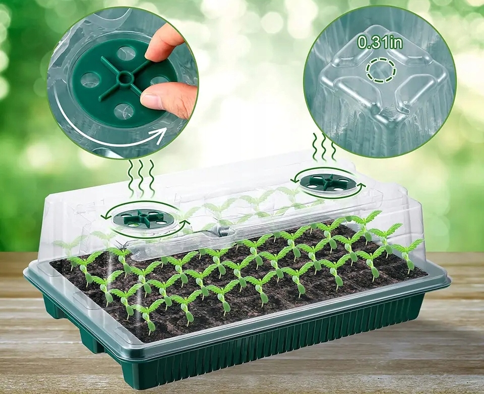 Przezroczysta pokrywa z regulowanymi otworami wentylacyjnymi, pozwalającymi na kontrolę wilgotności.