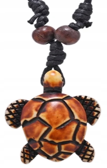 Wyjątkowy naszyjnik z wisiorkiem w kształcie żółwia to idealny wybór dla tych, którzy cenią oryginalne i etniczne akcenty w swojej biżuterii. Naszyjnik wykonany z naturalnego, czarnego sznurka bawełnianego jest regulowany, co pozwala na idealne dopasowanie długości do indywidualnych potrzeb. Wisiorek, starannie wykończony z żywicy, przyciąga uwagę swoją unikatową teksturą i wzornictwem.
