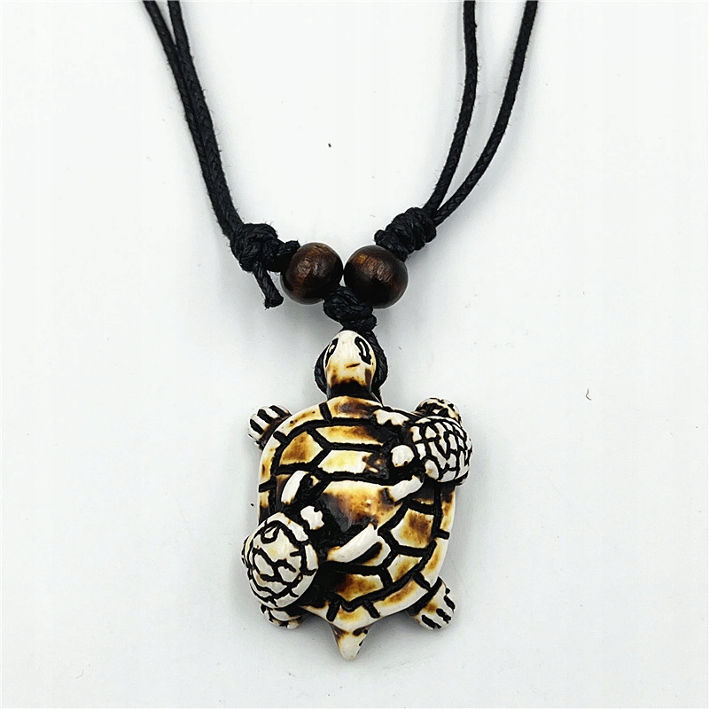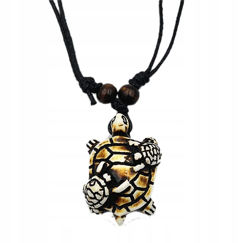 Wyjątkowy naszyjnik z wisiorkiem w kształcie żółwia to idealny wybór dla tych, którzy cenią oryginalne i etniczne akcenty w swojej biżuterii. Naszyjnik wykonany z naturalnego, czarnego sznurka bawełnianego jest regulowany, co pozwala na idealne dopasowanie długości do indywidualnych potrzeb. Wisiorek, starannie wykończony z żywicy, przyciąga uwagę swoją unikatową teksturą i wzornictwem.