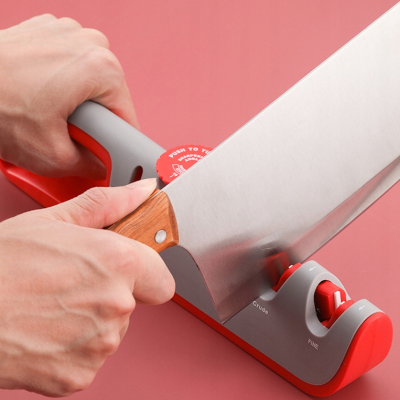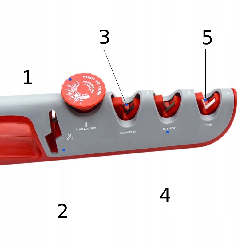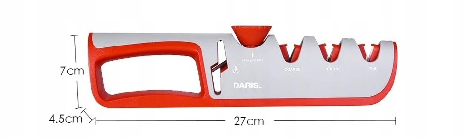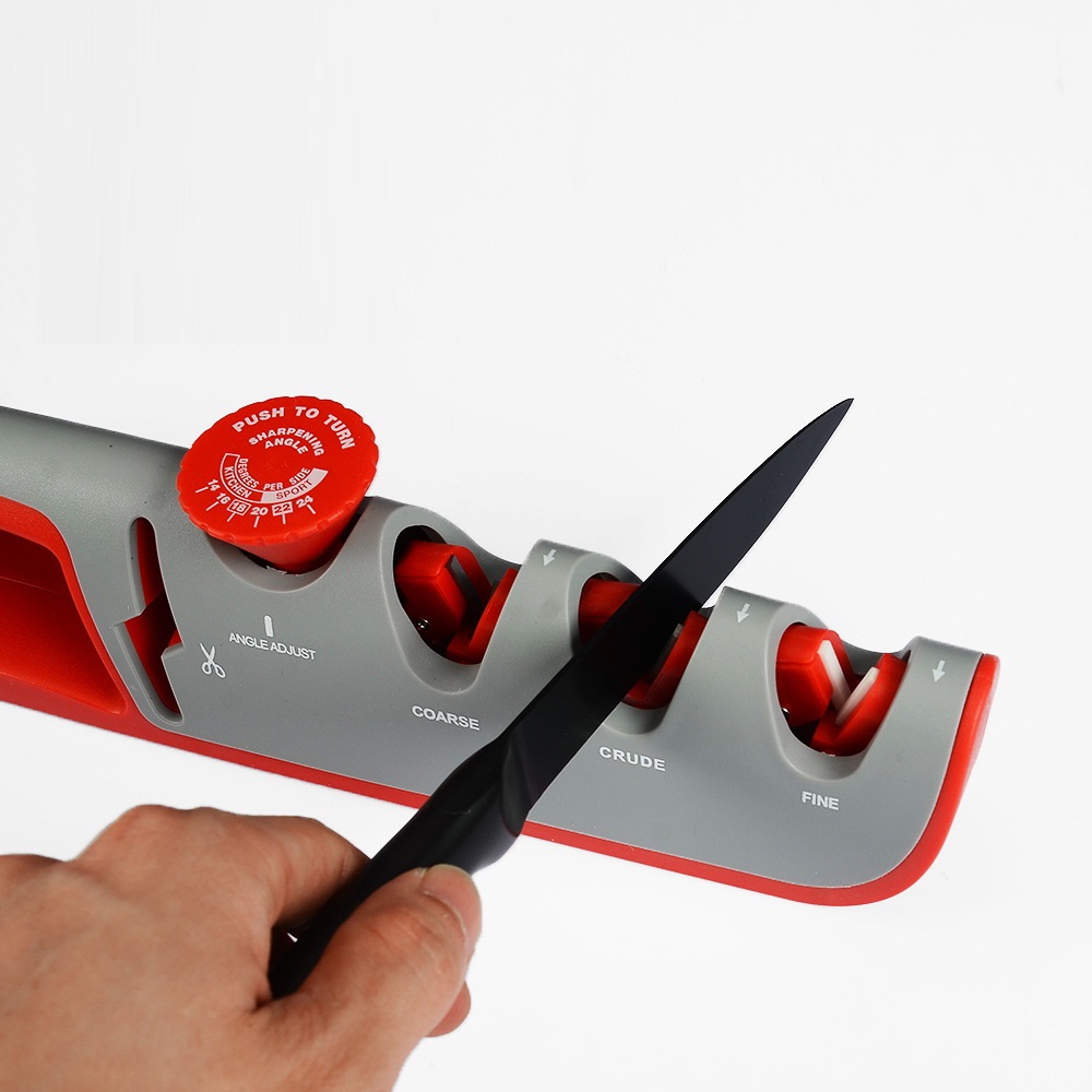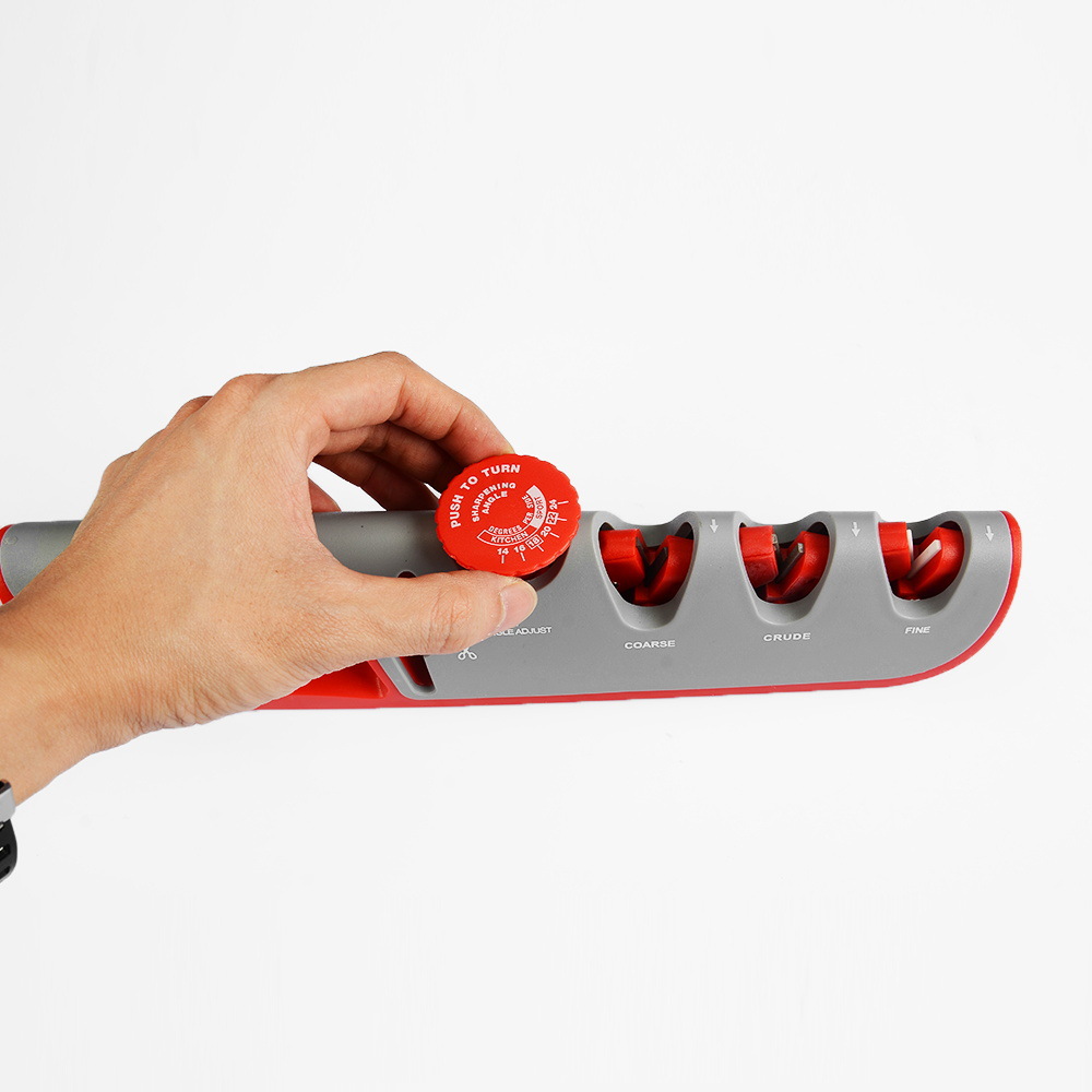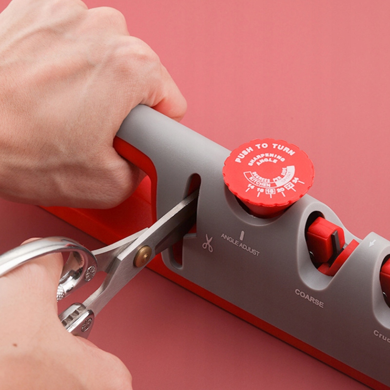 Genialna ostrzałka 4w1 - aż trzy różne końcówki do ostrzenia noży, regulator do kąta nachylenia ostrzałek oraz ostrzałka do nożyczek.