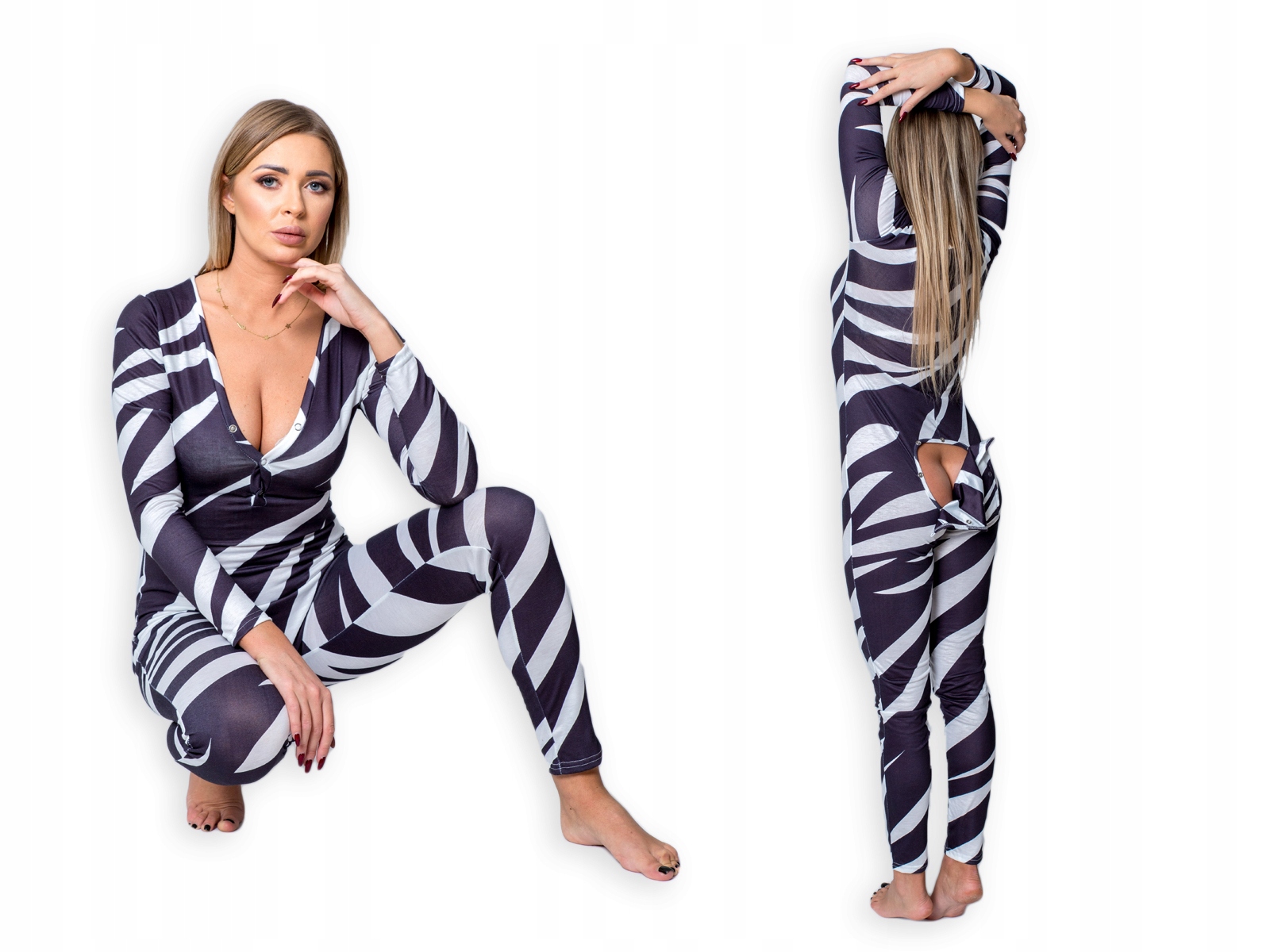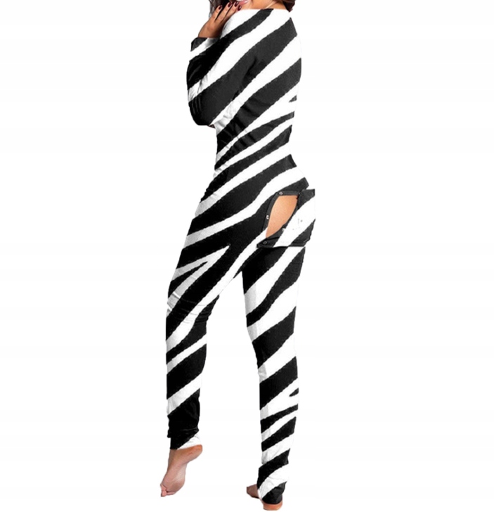 Piżama BOSTI z otwieraną klapką otwieraną na metalowe napy na wysokości pośladków. Przyjemny materiał zarówno na zimę jak i lato. Rozpinany dekolt.