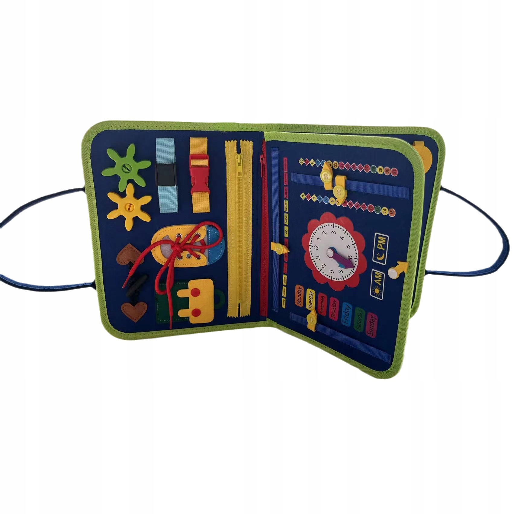 - Bogata Zawartość Edukacyjna: Ta tablica zapewnia szereg różnorodnych zadań, takich jak nauka godzin na zegarze, rozpoznawanie i dopasowywanie kształtów, wiązanie butów, poznawanie liter i wiele innych.