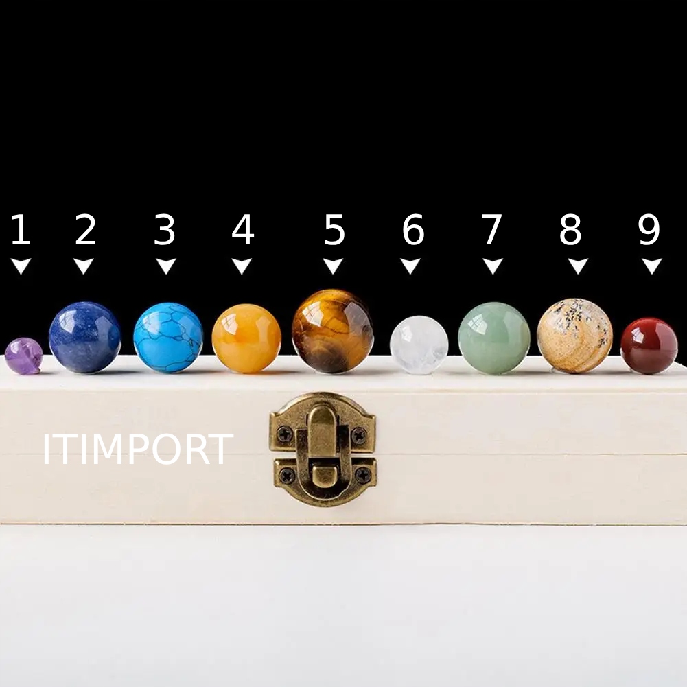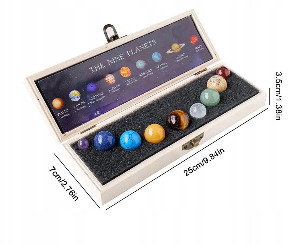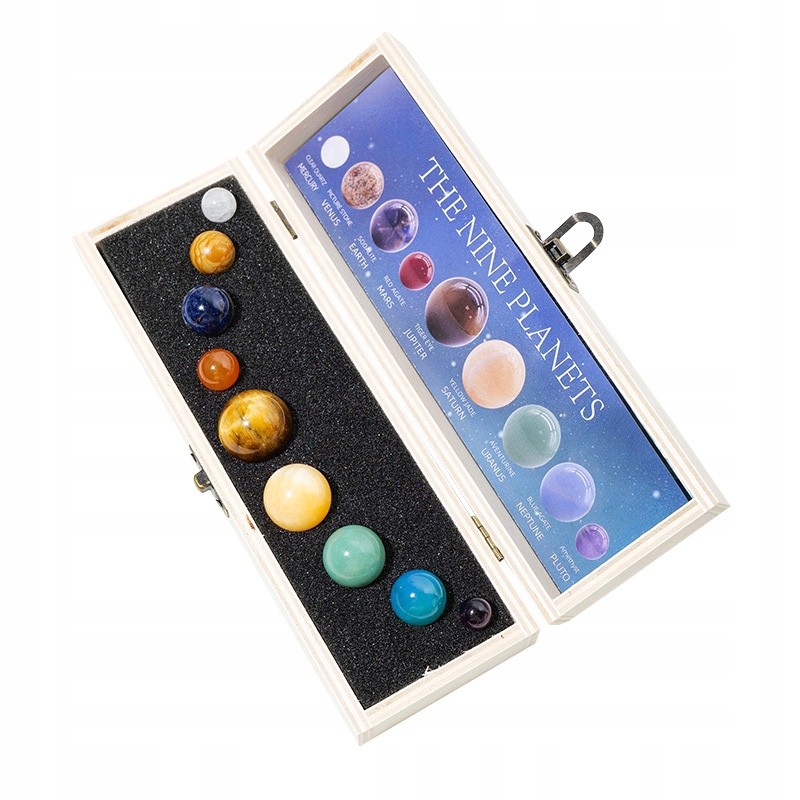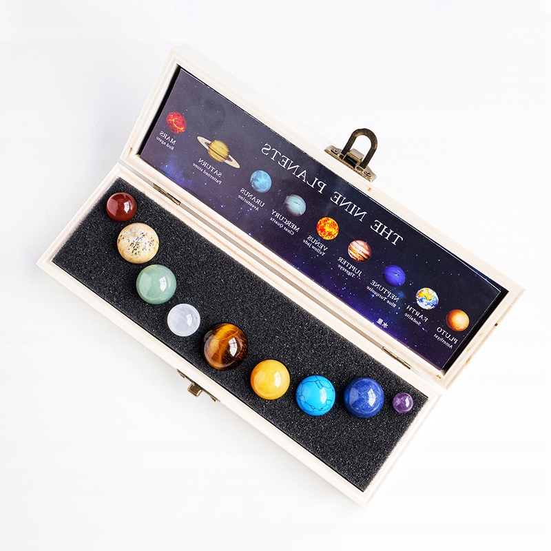UKŁAD SŁONECZNY MIENRAŁY KAMIENIE W DREWNIANEJ SZKATUŁCE PREZENT 9 PLANET