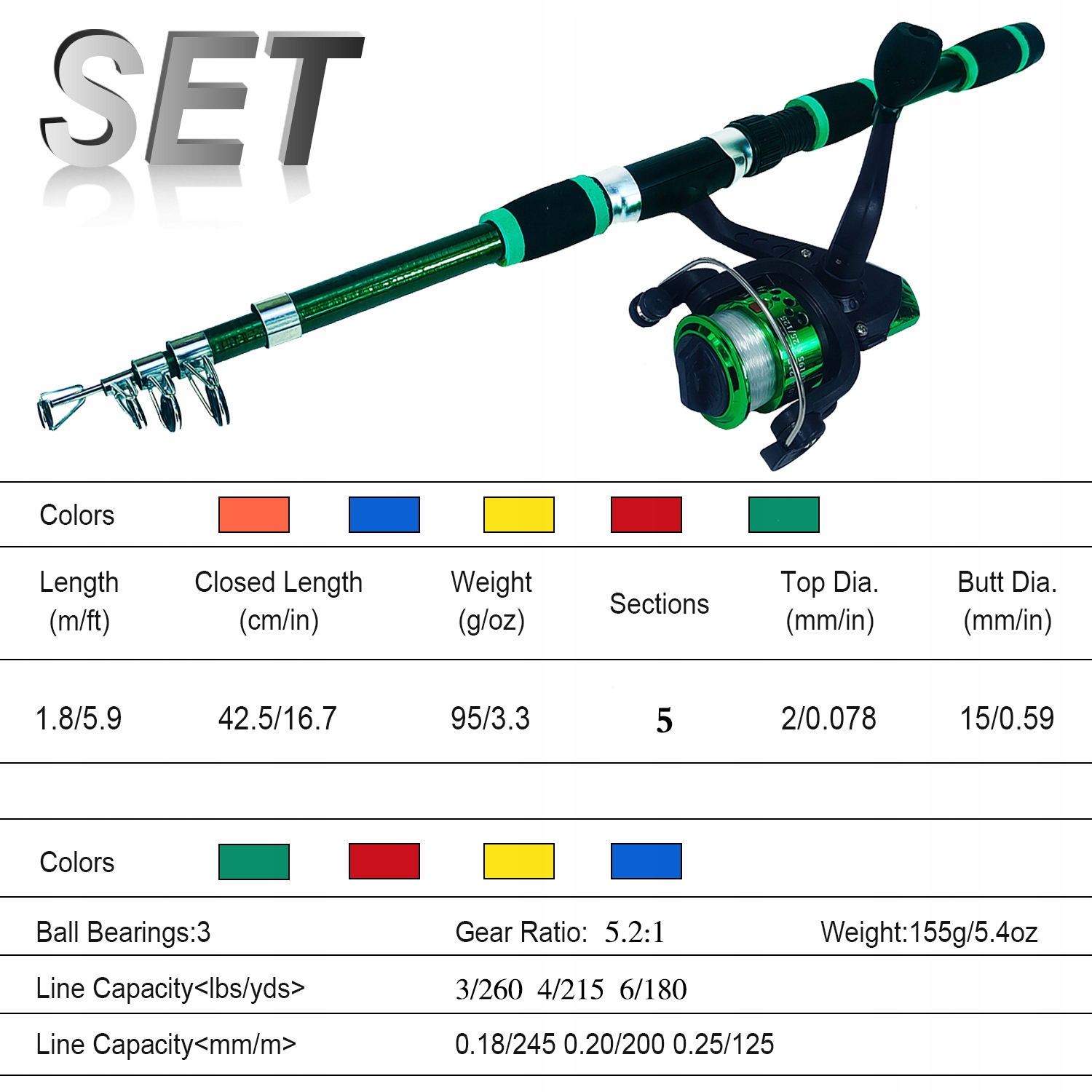 Wędka 1.8m zestaw kołowrotek przynęty dla dzieci