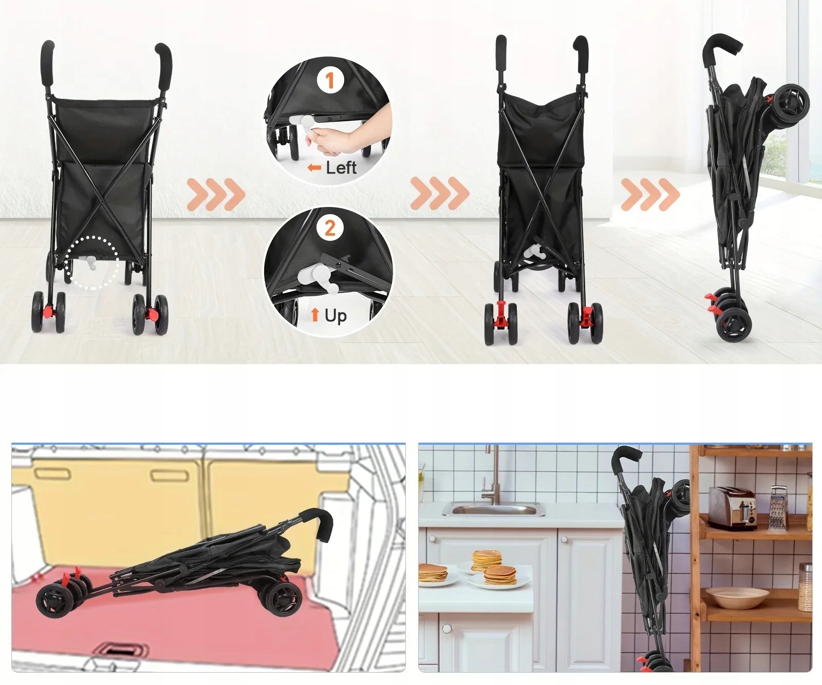 Łatwe składanie – szybki system składania jedną ręką, wózek po złożeniu zajmuje niewiele miejsca – zmieści się w bagażniku lub za drzwiami