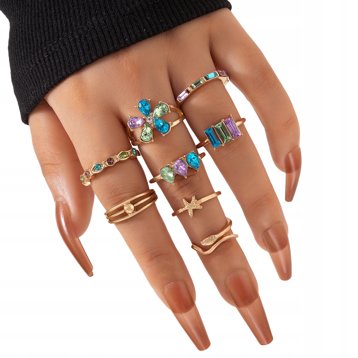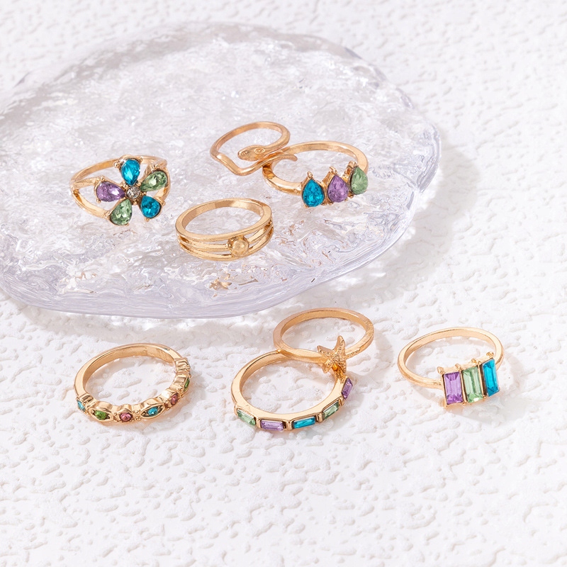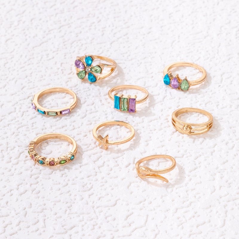 Zestaw złotych pierścionków retro punk vintage 8 sztuk kolorowe kwiatek