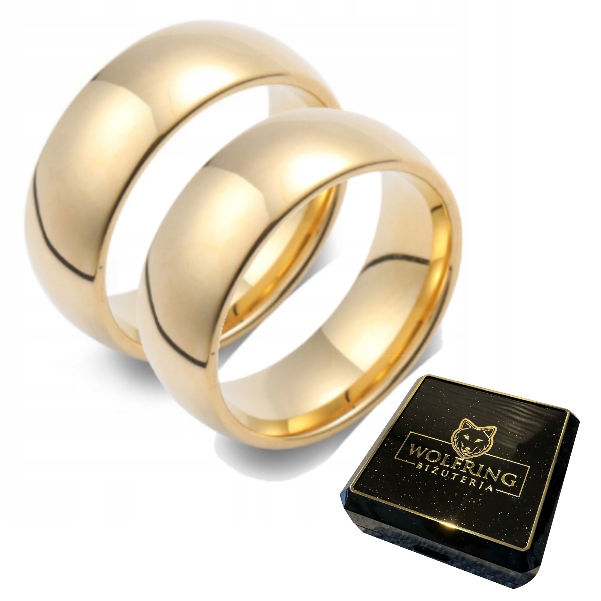 W komplecie podwójne eleganckie pudełko firmy WOLFRING BIŻUTERIA na dwie obrączki.